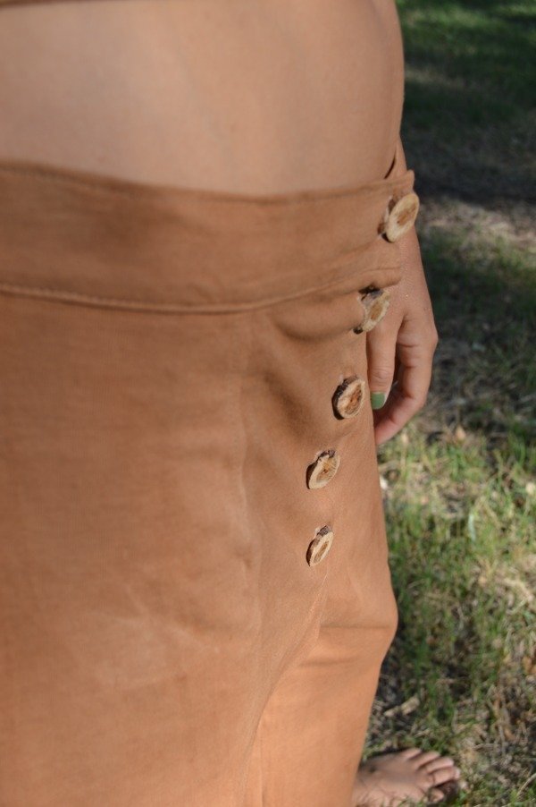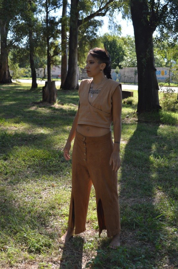 Blusa entallada sin mangas de jersey pesado con escote cruzado. Pantalón recto de jersey pesado de largo medio con botones de madera y tajos frontales.
