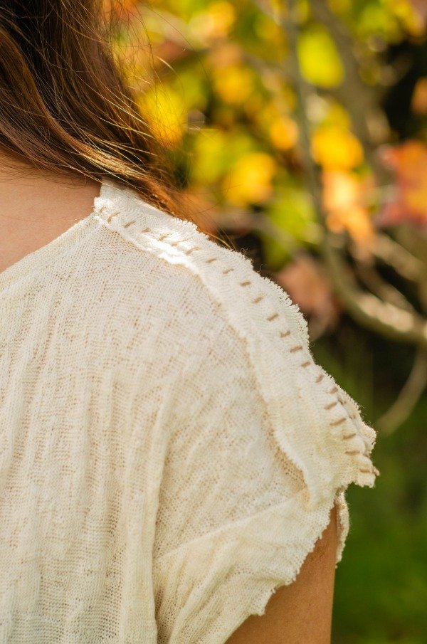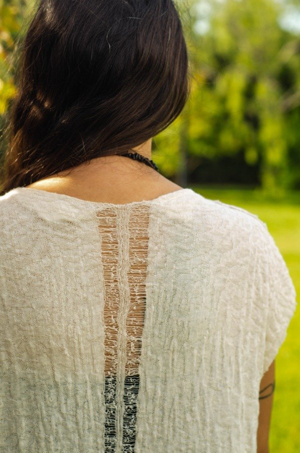 Chaleco de algodón agroecológico cortado en moldería rectangular para no generar descarte (casi cero desperdicio). Es una pieza entera, sin costuras a los costados, sólo en hombros y con pinzas en el busto. Tiene botones artesanales de madera y presillas y bordados en el hombro en hilo de algodón agroecológico teñido con tintes vegetales. Los botones están cosidos con el mismo hilo y estan dispuestos en diagonal, lo que permite que caiga en forma de trapecio.