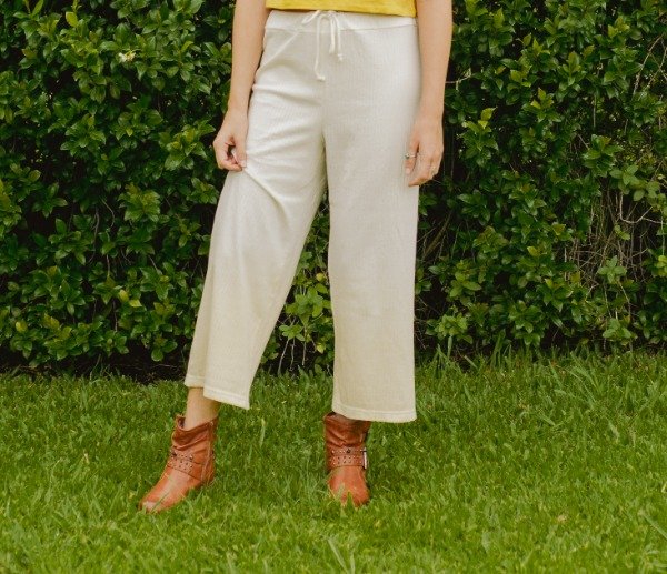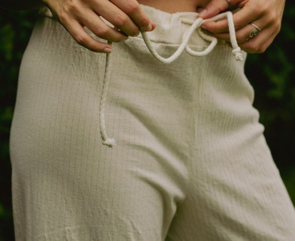Pantalón recto de ribb sin costuras laterales con cintura con cordón, todo algodón natural 100%.